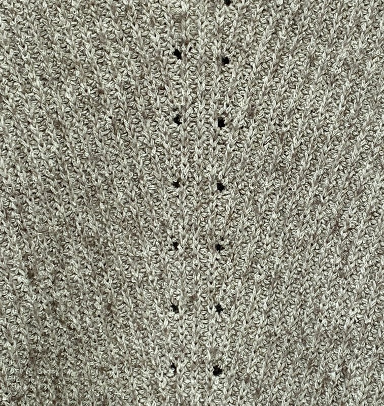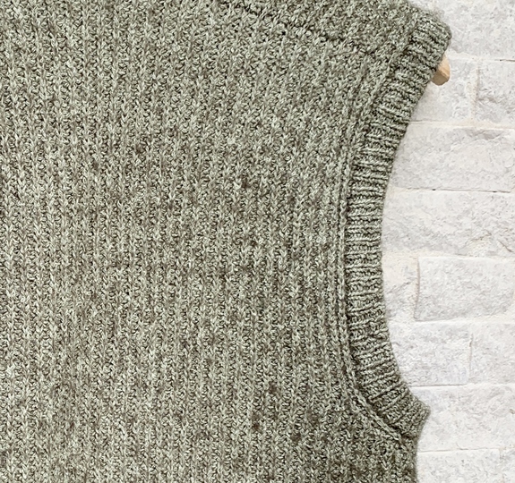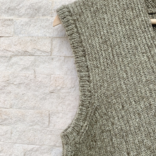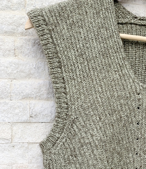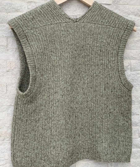 Dieser selbstgestrickte Pullunder in Halbpatent hat einen klassischen V-Ausschnitt, der dem Design eine elegante Note verleiht. Das Lochmuster in der Mitte unter dem V-Ausschnitt sorgt für eine interessante optische Abwechslung. Die langgezogenen Armausschnitte geben dem Pullunder eine moderne Silhouette und werden mit einem doppelten Bündchen umsäumt, was für einen sauberen Abschluss sorgt.