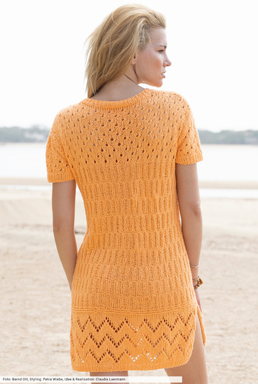 Neue Garnkombinationen stehen in diesem Sommer hoch im Kurs. Hier ist es edles Ramie, das zu den Bastfasern zählt, und das mit Baumwolle angereichert wurde. Es lässt sich wunderbar auf der Haut tragen und bringt die Musterstrukturen dieses Kleides toll zur Geltung. Dafür beginnst du mit einer Zackenpasse, setzt die Arbeit mit einfachen Rechts-Links-Strukturen fort und endest im oberen Bereich mit einem luftdurchlässigen Lochmuster, das auch bei den kurzen Ärmeln zum Einsatz kommt.