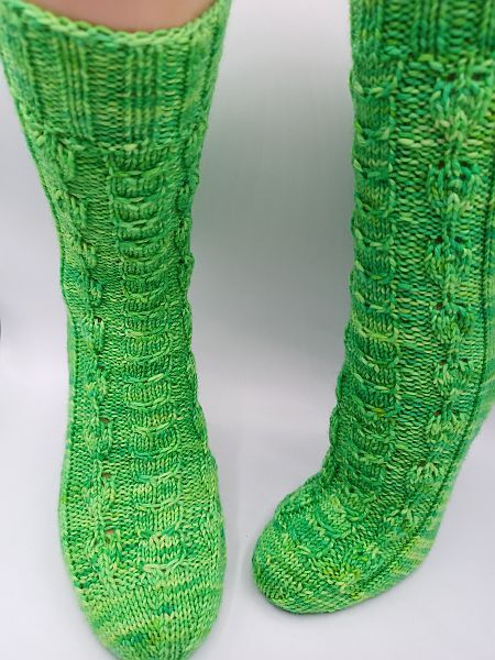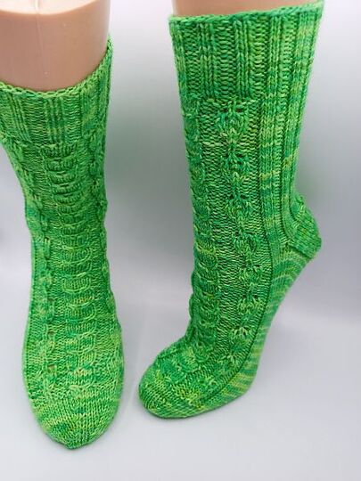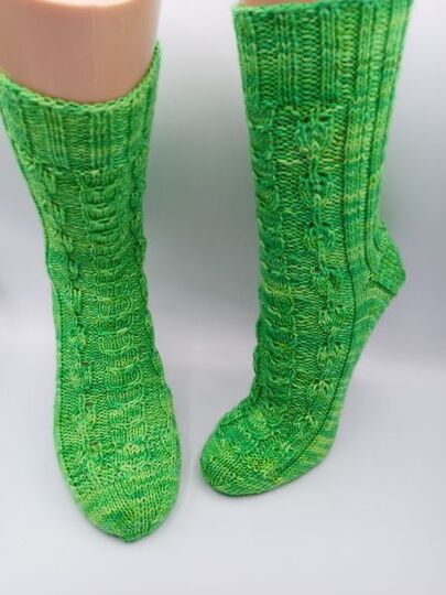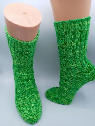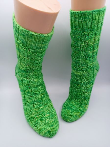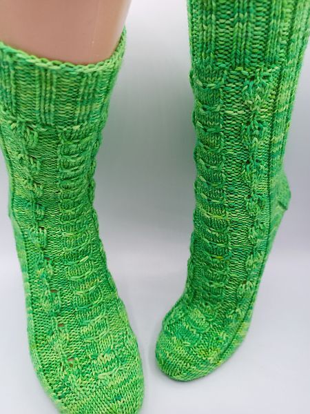 Unsere neue Sockenanleitung enthält eine fließende Verzopfung,umrahmt von seitlichen Blattmustern, das auf allen üblichen Garnstärken nach gestrickt werden kann.