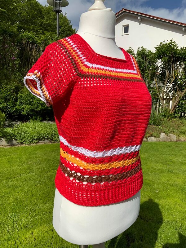 Er wird von oben nach unten in RVO Technik gehäkelt.