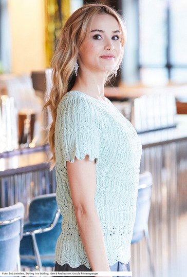 Dieser Kurzarmpulli wird in einem Stück von unten nach oben in Runden gestrickt. Das lästige Zusammennähen entfällt also. Es wird zweifädig gearbeitet: Das mintfarbene Baumwolle-Viskose-Leinen-Garn wird durch das mitlaufende, dünne weiß-silberne Lurexgarn aus Baumwolle und Polyester aufgepeppt. Für die Musterstreifen wird abwechselnd ein Ajourmuster und ein Lochrippenmuster gearbeitet. Der runde Halsausschnitt endet mit ein paar cm in kraus rechts. Das Ajourmuster bildet an der Anschlagkante Zacken, die mit je drei Perlen geschmückt sind. Eine Anleitung steht für die Größen 36/38, 42/44 und 48/50 zur Verfügung.