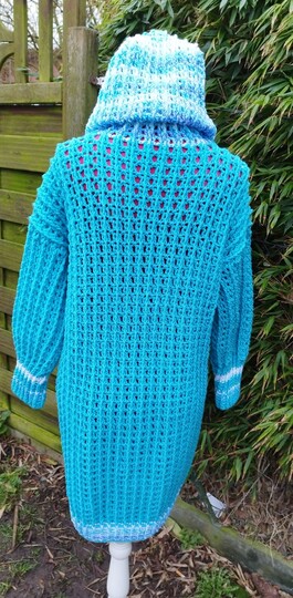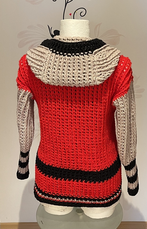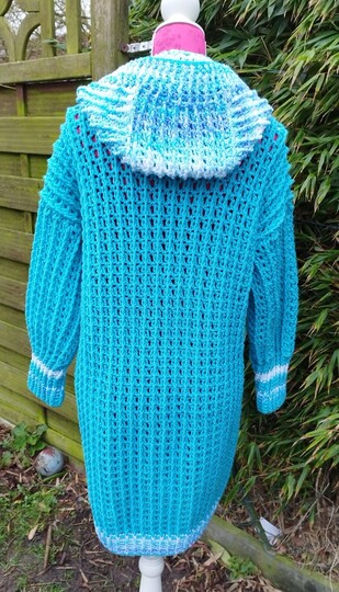Der Köper und die Kapuze werden in Farbe A und die Blende und Arme in Farbe B gehäkelt oder häkel im Streifen Look so wie es dir gefällt.
