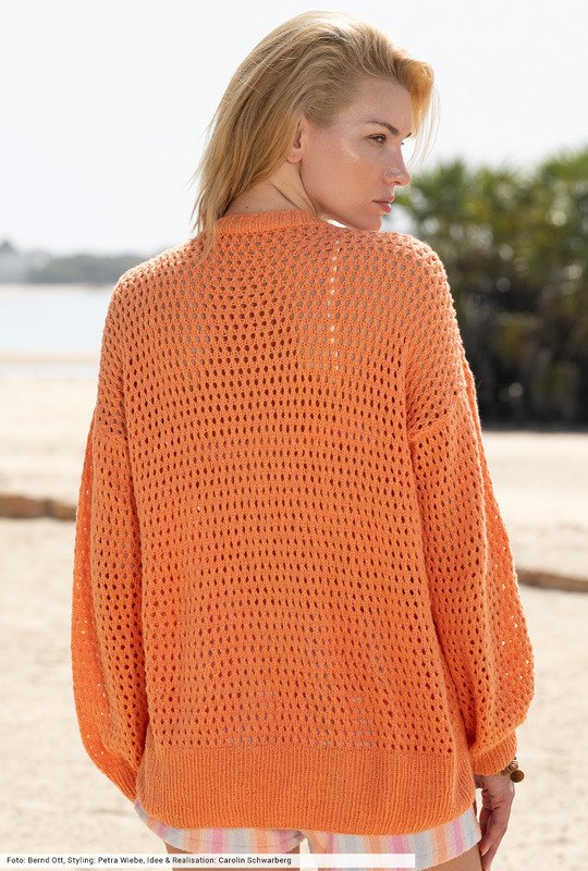 Wenn's kühler wird, einfach drüberziehen und sich wohl fühlen: Diese Jacke in heiterem Apricot ist schnell über den Bikini oder das Top gezogen und umschmeichelt mit der lockeren Silhouette unseren Körper. Diese entsteht nicht nur durch den Oversizeschnitt, sondern auch durch das luftige Lochmuster, das sich ganz einfach stricken lässt. Dafür musst du bei der Konfektion der Teile aufpassen, insbesondere bei der Fertigung der Rippenblende, die über die ganze Innenkante zum Einsatz kommt.
