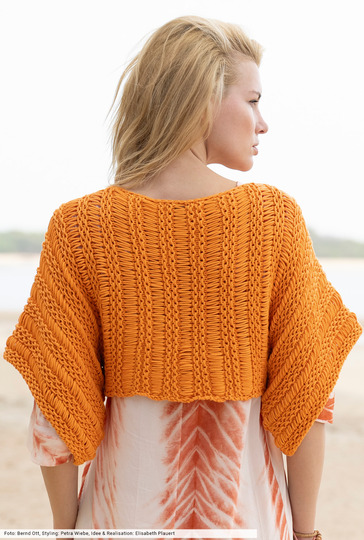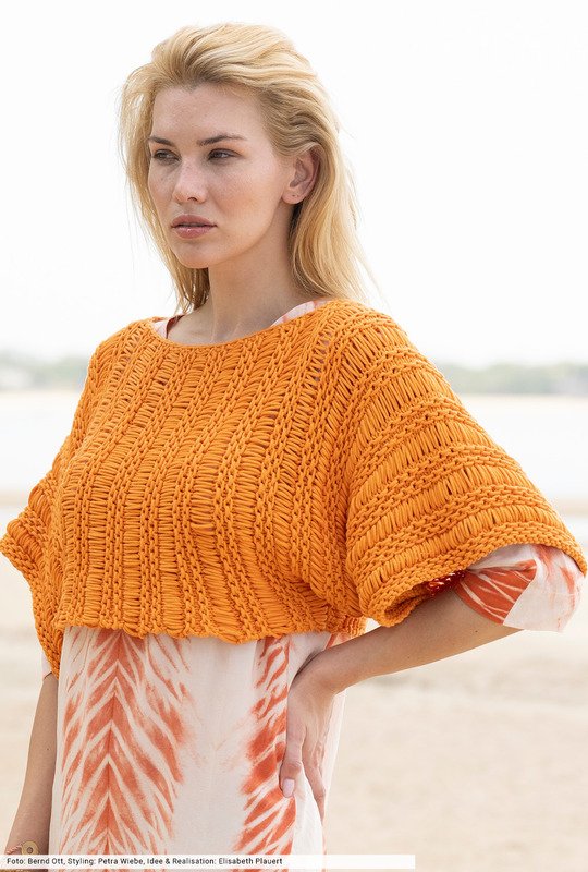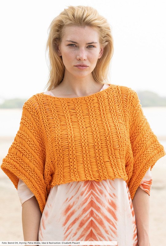 Ein griffiges Dochtgarn in strahlendem Orange bildet die Grundlage für das hübsche Shirt, das wir von Ärmel zu Ärmel gestrickt haben. Dadurch erhalten die transparenten Fallmaschen eine ganz neue Optik. Zur Stabilisierung haben wir markante Reliefstreifen hinzugefügt. Diese ungewöhnlich Kombination ist in der Anleitung genau beschrieben. Zu Kleidern und Röcken getragen ist dieser taillenkurze Pulli eine Bereicherung deiner Sommergarderobe und wertet jedes Outfit gekonnt auf.