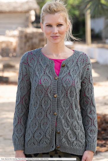Kühles Salbeigrün ist retro und zeitgemäß zugleich. Wir haben es mit einem markanten Lochrauten-Muster ausgestattet, das sich gleichmäßig über alle fünf Teile zieht und einen lässigen Cardigan entstehen lässt. Schmale Rippenbündchen sorgen für die sportlich-lässige Ausstrahlung, die auffälligen Metallknöpfe greifen perfekt den Military-Stil auf. Unser Resumée: ein tolles Stück, das nicht nur mit Pink kombiniert den topmodischen Charakter erhält.