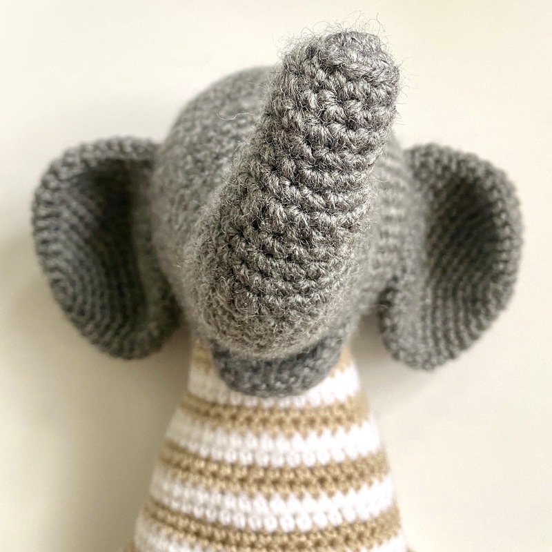 Der Körper von Evelyn ELEFANT wird vom Fuß ausgehend bis zum Hals durchgehend gehäkelt. Der Kopf und die anderen Teile werden angenäht. Zwischendurch wird mit Füllwatte gestopft. Alle Schritte sind in der Anleitung beschrieben.