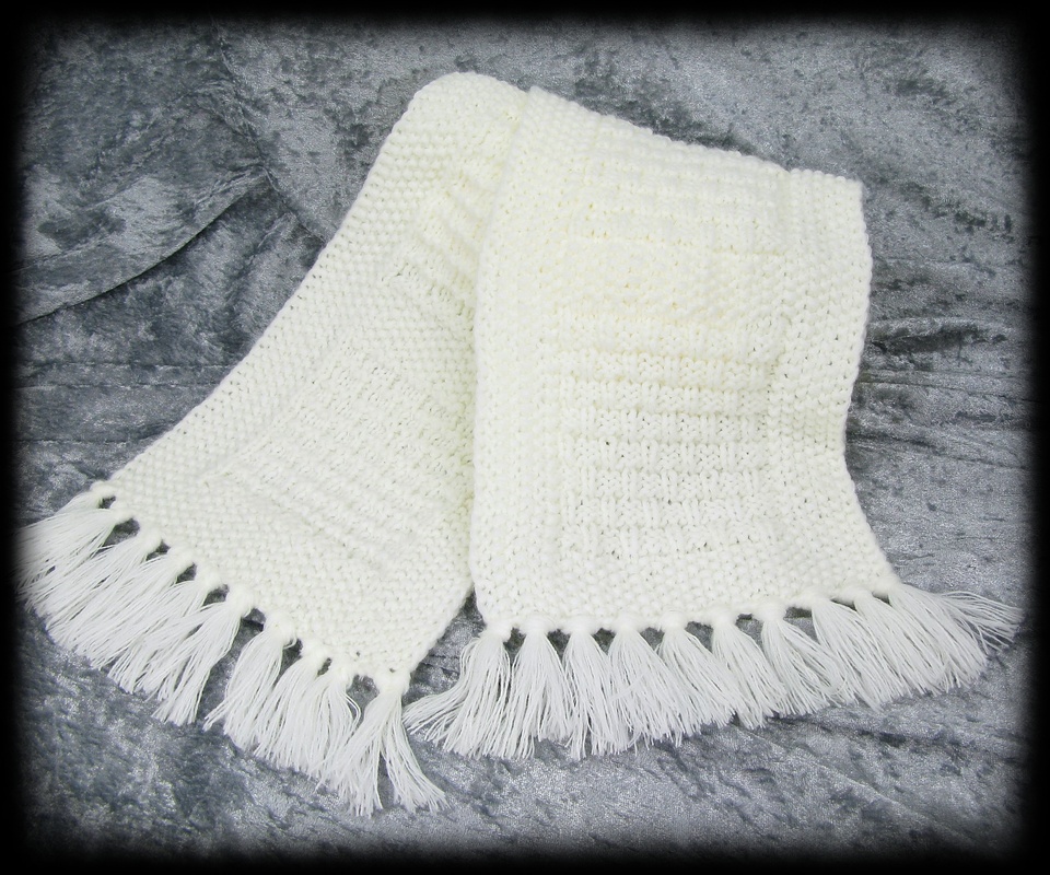 Stricknadelnl 4,5mm, große Häkelnadel für die Fransen.
