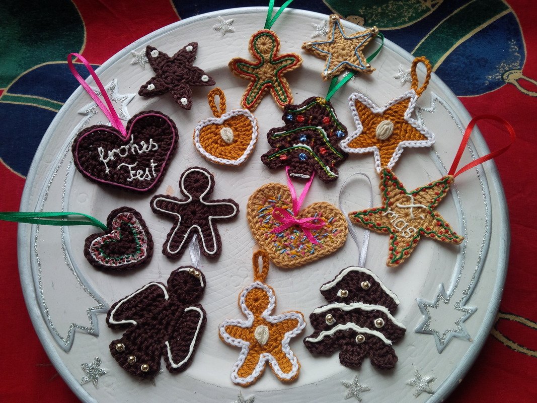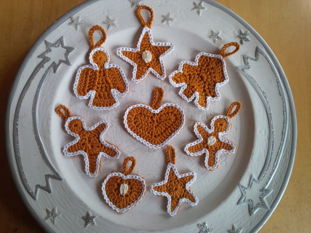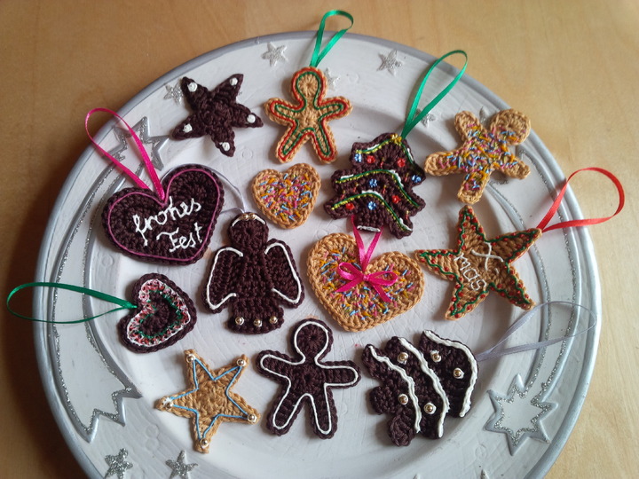 Die gehäkelten Weihnachtskekse können als Deko für den Weihnachtstisch z.B. als Platzkarte,