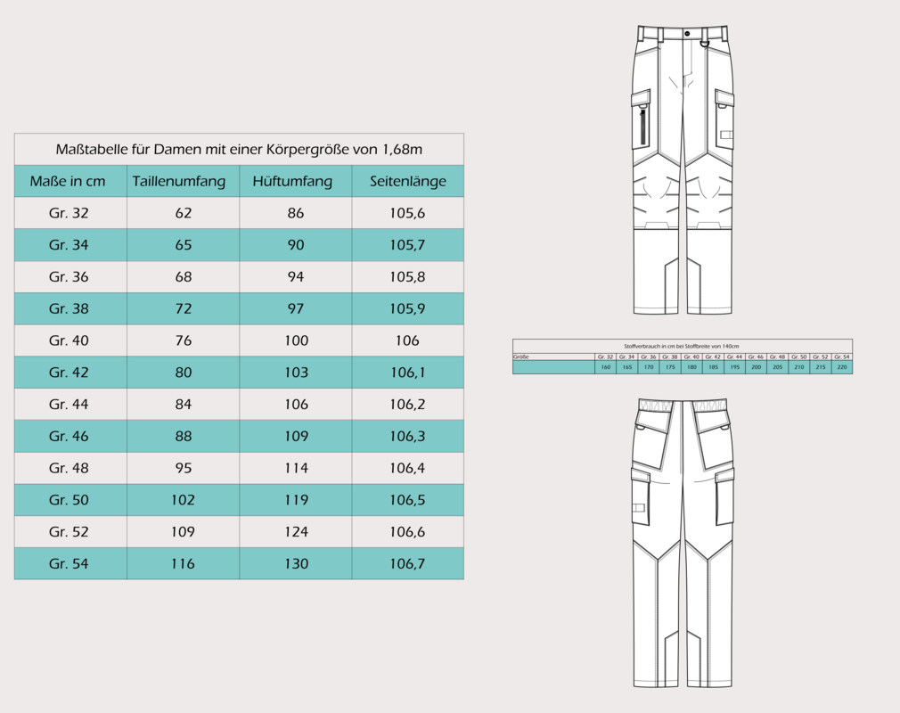 Im Schnittmuster enthalten sind die Damengrößen 32 - 54 (ausgelegt auf 1,68m Körpergröße)