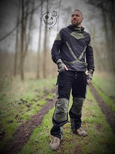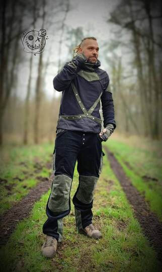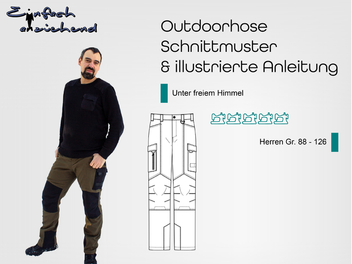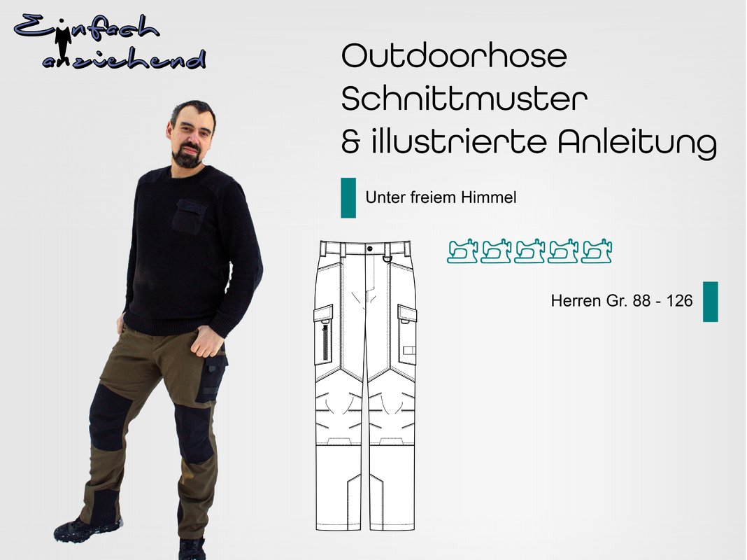 Dieser Schnitt für eine Outdoor-/Arbeitshose aus mittelschwerer bis schwerer Webware mit insgesamt 6 Taschen und einer zusätzlichen Reißverschlusstasche, mehreren Laschen zum Einhängen von Zubehör, einem bequemen Bund dank Gummizug im Rücken und vielfältigen Knieoptionen, trägt den schönen Namen "Unter freiem Himmel". Das Schnittmuster beinhaltet natürlich eine ausführliche Anleitung und die Herren Größen 88 - 126 (schlanke Größen).