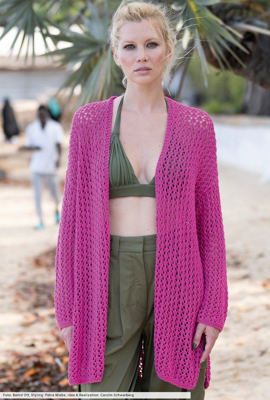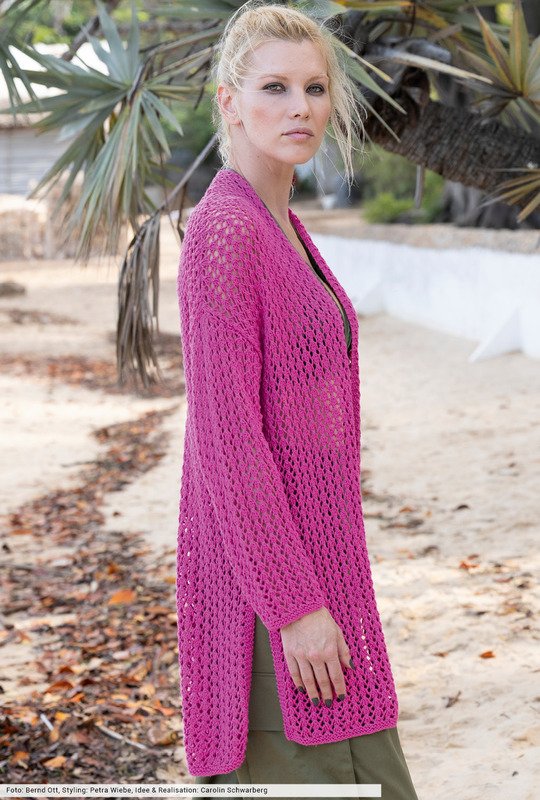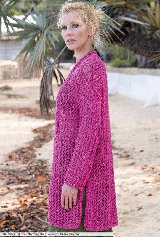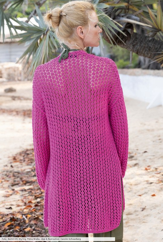 Transparente Jacken und Mäntel werden in diesem Sommer ganz groß geschrieben. Nach dem Motto "See through" lässt diese verschlusslose Longjacke durch das lockere Netzmuster viel Luft an die Haut und gibt auch einen Blick für Tops und Bikinioberteile frei. Der lässige Schnitt und die hohen Seitenschlitze sind Garanten für jede Menge Bewegungsfreiheit. Praktisch sind auch die schmalen Kraus-rechts-Blenden, die an den Saum-, Schlitz-und Vorderteilkanten gleich mitgestrickt werden.