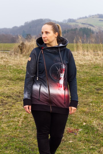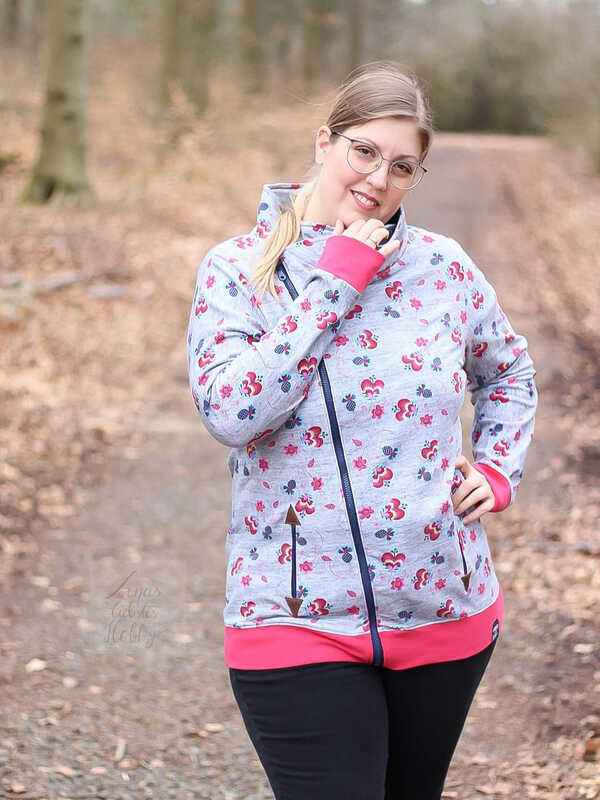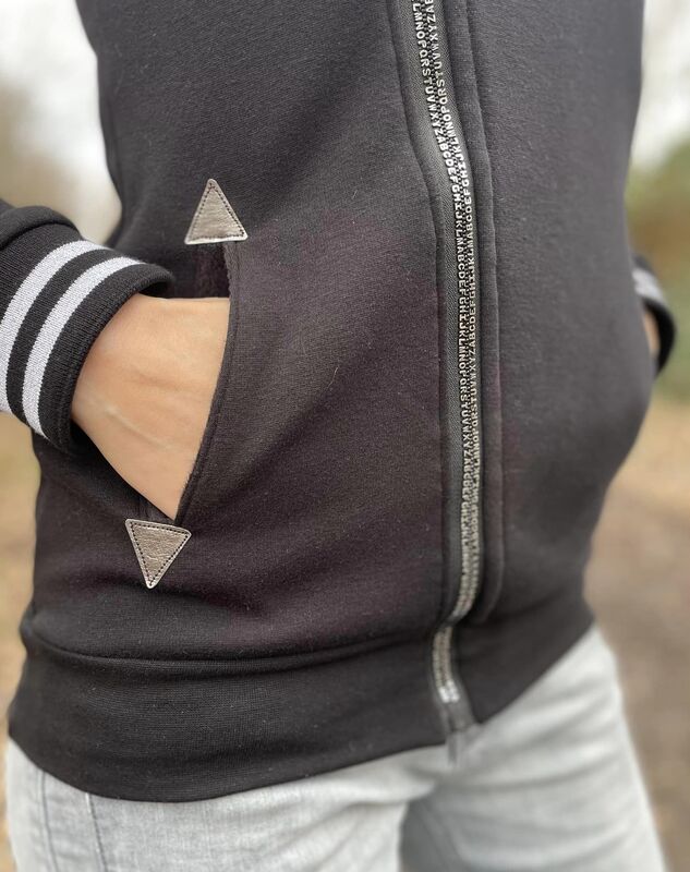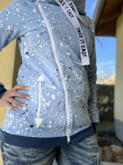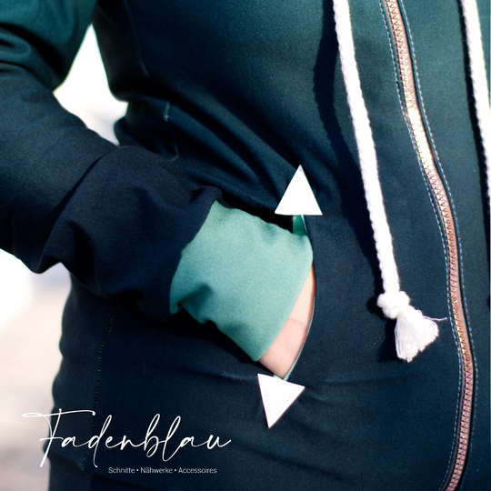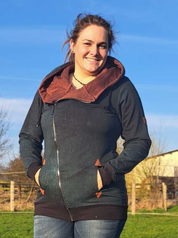 Die BlueSweetJack ist eine Sweatacke mit schrägen Reißverschluss. Du hast die Wahl zwischen Kapuze und Kragen. Optische Highlights setzen die Eingrifftaschen mit Patches. Diese kannst du mit oder ohne Reißverschluss nähen. Die Patches sind in verschiedenen Formen als Vorlage im Schnitt enthalten. Du kannst diese easy mit dem Plotter oder Schere zuschneiden. Durch die inneren Belege schaut die BlueSweetJack auch offenen getragen gut aus.