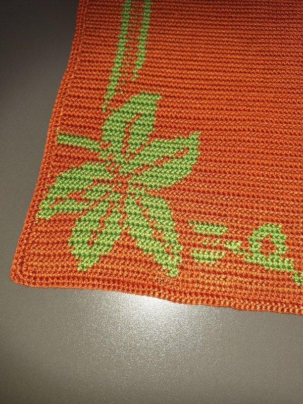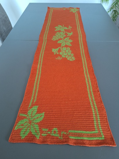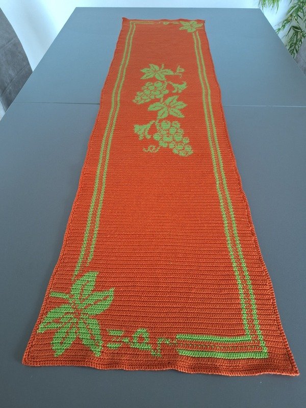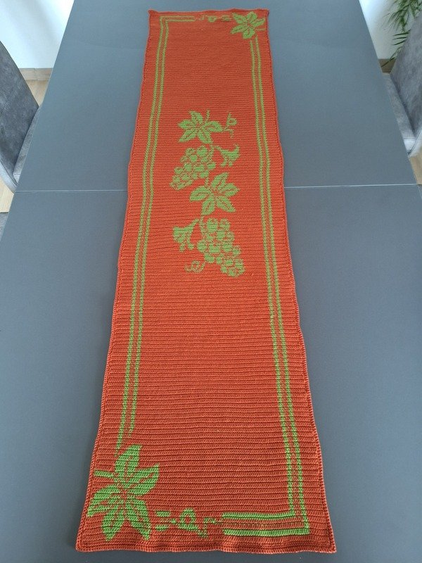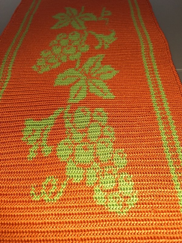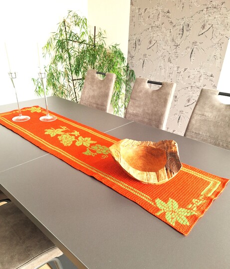 Hier kannst du einen wunderschönen Tischläufer mit Weinlaub und Trauben häkeln, gehäkelt wird in Tapestrytechnik, du siehst das Motiv auf der hinteren Seite spiegelverkehrt ohne Fäden, da diese bei dieser Technik mit in die Reihen eingehäkelt werden.