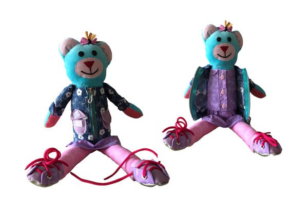 Genäht werden die Bären aus Kuschelstoffen wie Fleece, Wellnessfleece, Nicki oder Minkeyfleece. Die Bekleidung wird aus Baumwollstoffen oder leichten Jeansstoffen genäht. Die Jacke kann auch aus French Terry genäht werden.