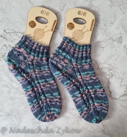 Die PDF Datei enthält die Anleitung für die oben beschriebenen Sneakersocken für die Größen 36/37, 38/39 und 40/41.