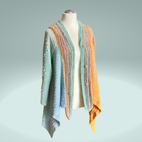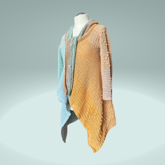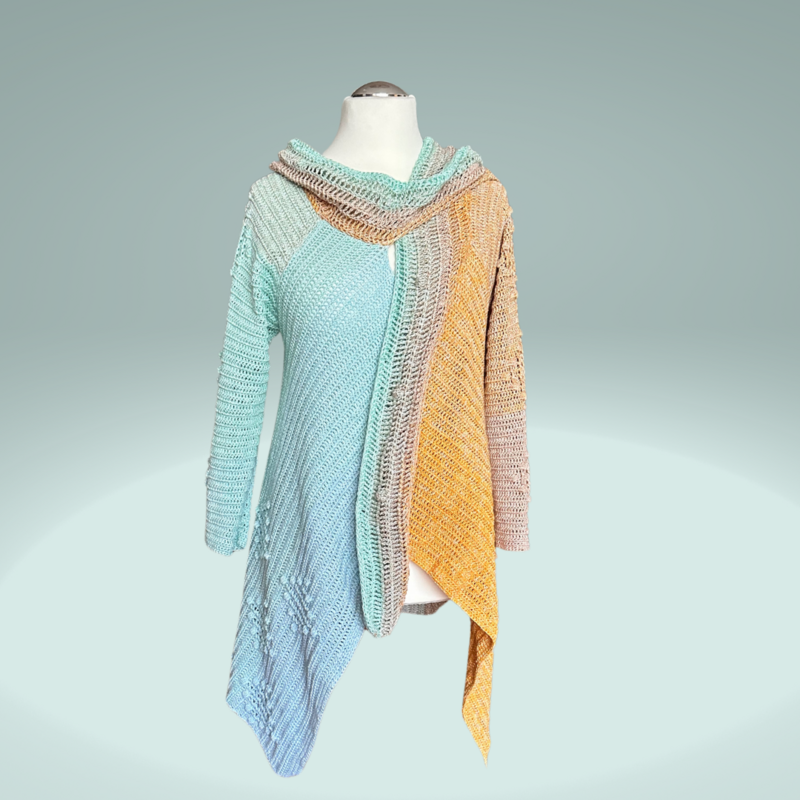 Dieser einzigartige Mantel wird seitwärts gehäkelt, wodurch der Farbverlauf des Garns auf faszinierende Weise zur Geltung kommt.
