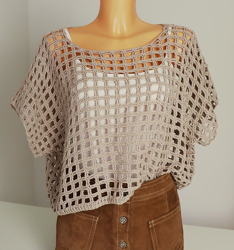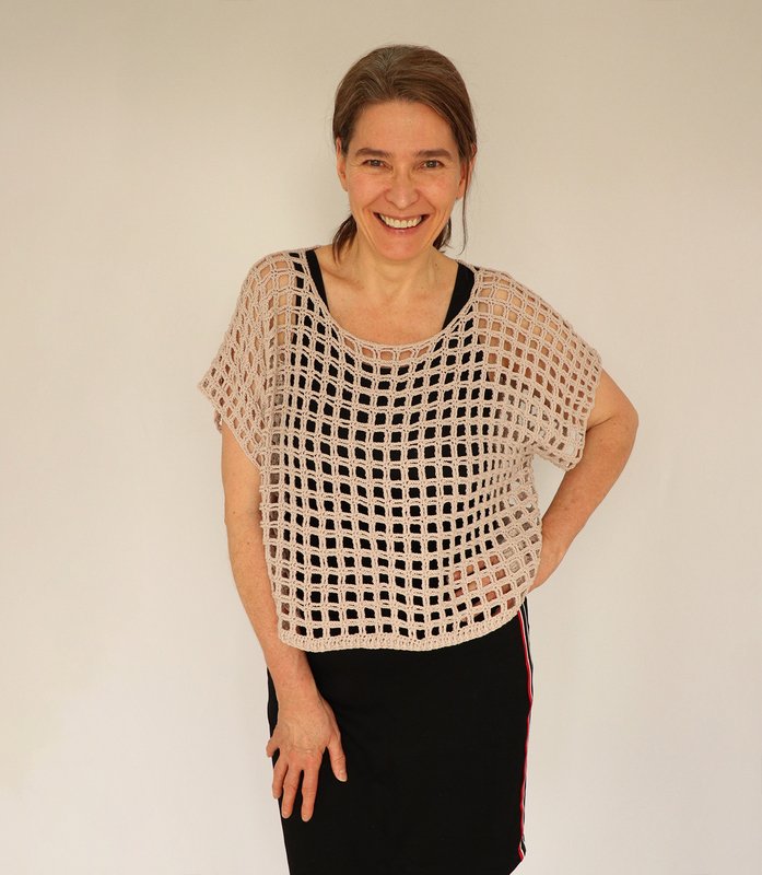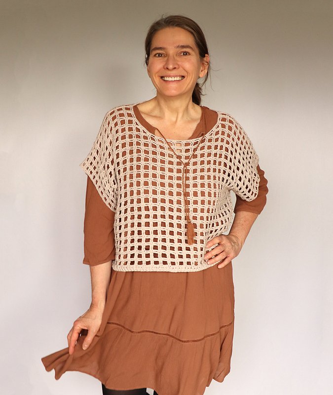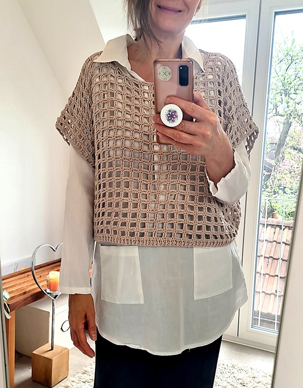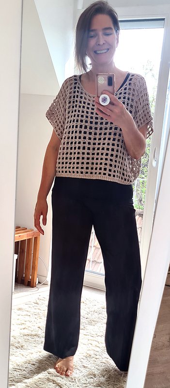 Das Shirt besteht aus Vorder- und Rückenteil. Nach dem Zusammennähen, was sehr detailliert erklärt wird, werden die Ärmel direkt angehäkelt. Am Ende sind keine Nähte zu sehen und der Pulli sieht aus als wäre er in einem Stück gehäkelt.