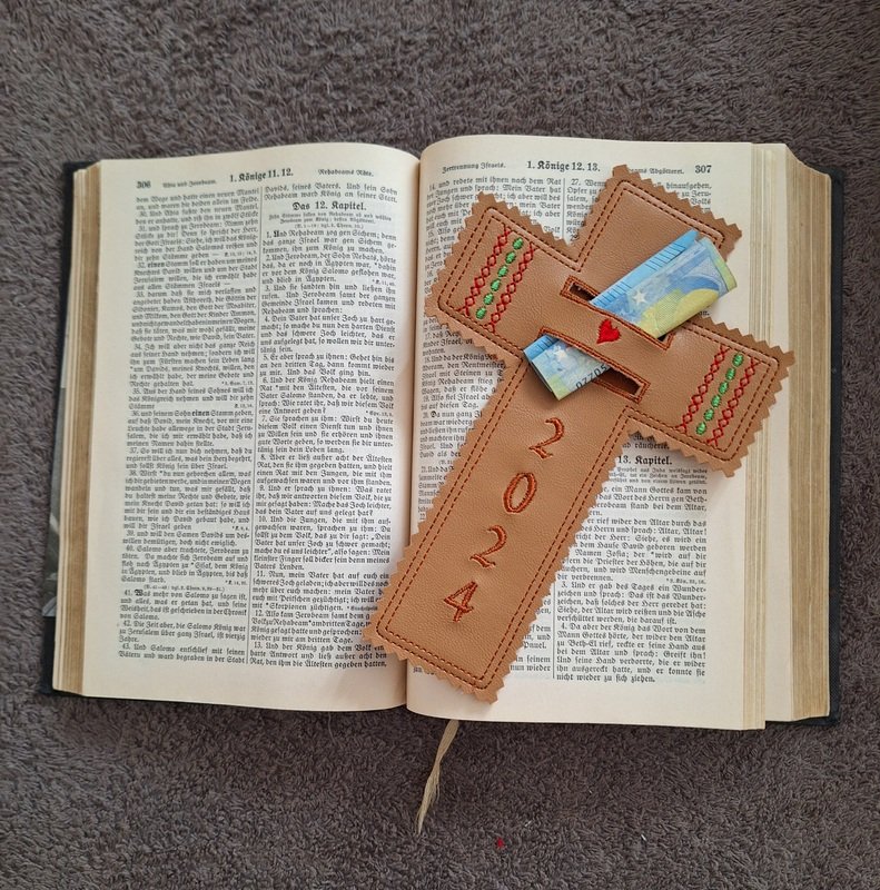 Es sind zweierlei Kreuze enthalten, die sich zum Verschenken von Geld oder von Stabkerzen eignen.