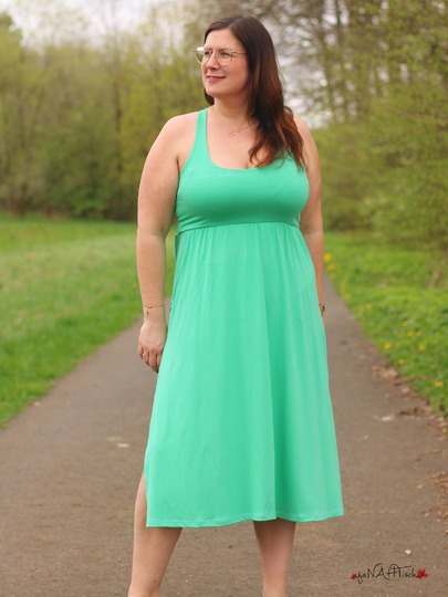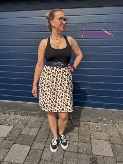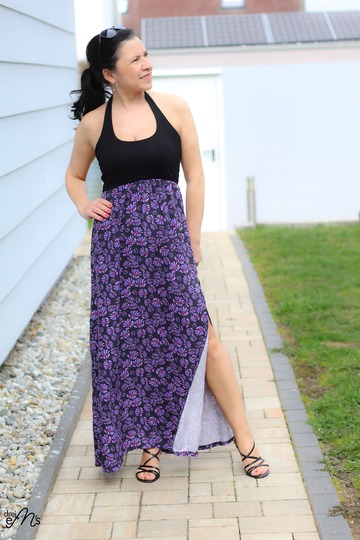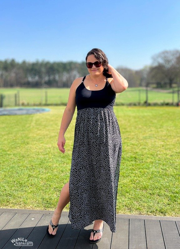 ANZING bekommst du in den Größen 32-50. Der Schnitt enthält 3 Längen (mini, midi, maxi) und optional Nahttaschen. Das Oberteil wird gedoppelt, somit hast du keine lästige Außennaht. Du kannst zwischen einem Neckholderoberteil oder einen Oberteil welches im Rücken gekreuzt genäht wird entscheiden. Das Rockteil enthält 2 Weiten und du kannst es optional mit einem, zwei oder keinem Schlitz nähen.