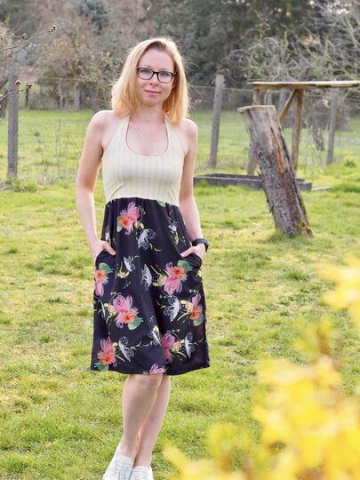 Du kannst das Kleid auch im Materialmix nähen. Das Oberteil ist super geeignet für Viskosejersey oder für dünnen Singlejersey. Das Rockteil eignet sich hervorragend für Viskose (Webware) oder Viskosejersey. Ebenso wurde auch Jersey komplett getestet und ist dafür geeignet.