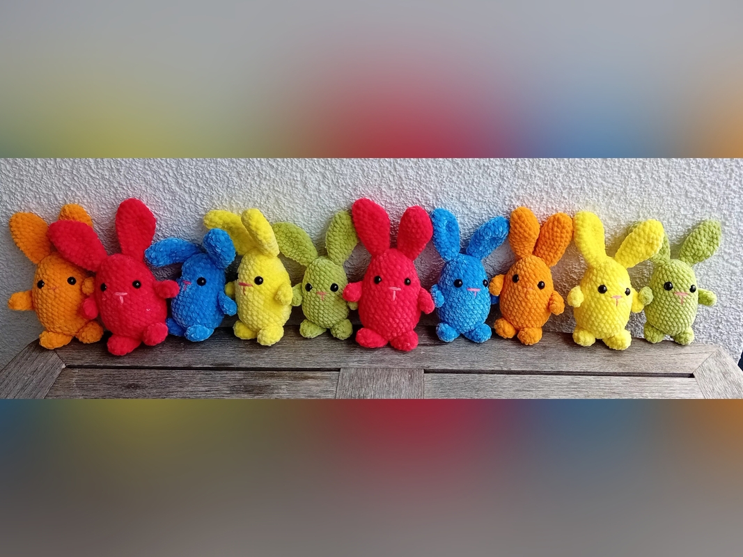 Das Ei wird in fortlaufenden Runden gearbeitet. Hergestellt aus Chenille Garn und Häkelnadel 3.5 mm, wird das Ei ca. 14 cm lang.