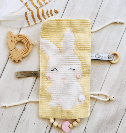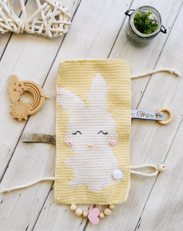 Fertige Größe: 28,5 cm lang und 14,5 cm breit, gehäkelt mit Drops Baby Merino Nr. 03 Hellgelb und Drops Baby Merino Nr. 01 Weiß und 2,0 mm Häkelnadel.