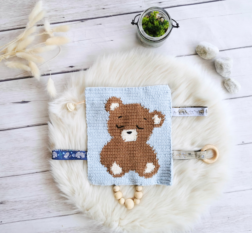 Fertige Größe: 19 cm lang und 16 cm breit, gehäkelt mit Drops Loves You #7 No. 26 Ice Blue, Drops L oves You #7 No. 37 Chocolate, Safran No. 1 8 Natural Wolle und 2,0 mm Häkelnadel.