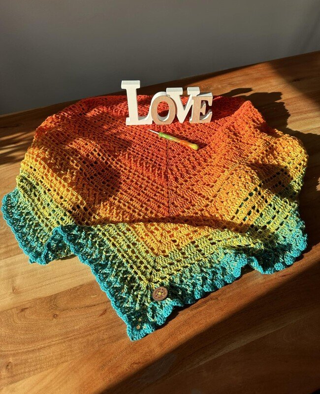 Das Tuch am Hauptfoto hat folgende Abmessungen: 190 x 90 cm. Das Tuch kann in jeder beliebigen Größe gehäkelt werden, da sich die Reihen wiederholen. Bitte beachte, dass die Größe abweichen kann, wenn du andere Wolle und eine andere Häkelnadelstärke verwendest, und wenn du lockerer/fester häkelst.