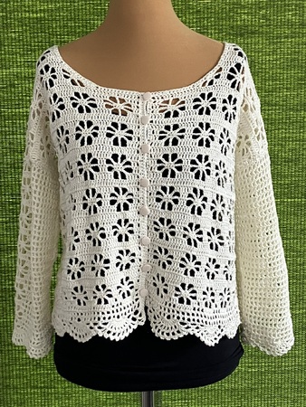Gewicht des fertigen Pullovers oder Jacke in Größe M mit ¾-Ärmeln: 450 g.