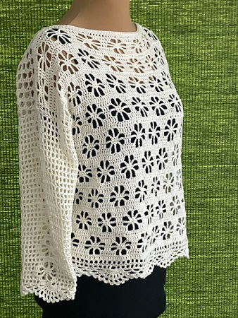 Ich zeige in der Anleitung, wie man verschiedene Pullis damit gestalten kann, z.B. ein Jäckchen, das man gut im Sommer über einem Kleid tragen kann. Oder ein Shirt zum Überziehen. Alle Varianten sehen schön aus, mit oder ohne Ärmel.Ich nenne sie "Bauchwegschummler", weil sie so geschnitten sind, dass die lässig (mit viel "Luft" ) nach unten fallen.Den unteren Abschluss bildet bei allen Modellen eine gehäkelte Spitze. Alle Schritte und Muster werden ausführlich mit Fotos, Text und Häkelschrift erklärt. Die Anleitung ist für alle Größen geeignet.