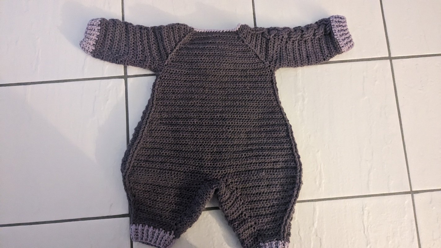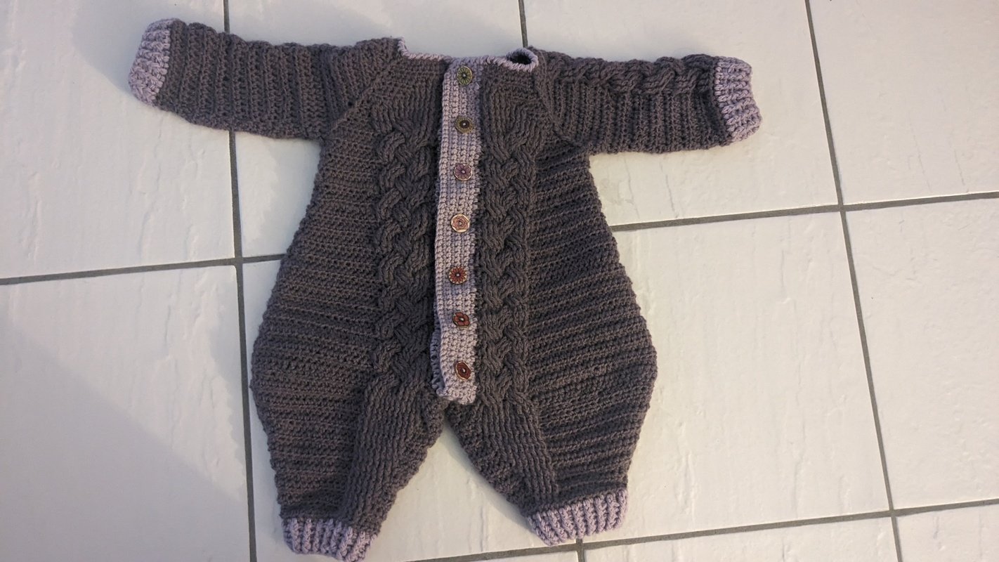 Eine 30-seitige, bebilderte Anleitung zum Häkeln des Stramplers Anouk mit Zopfmuster.