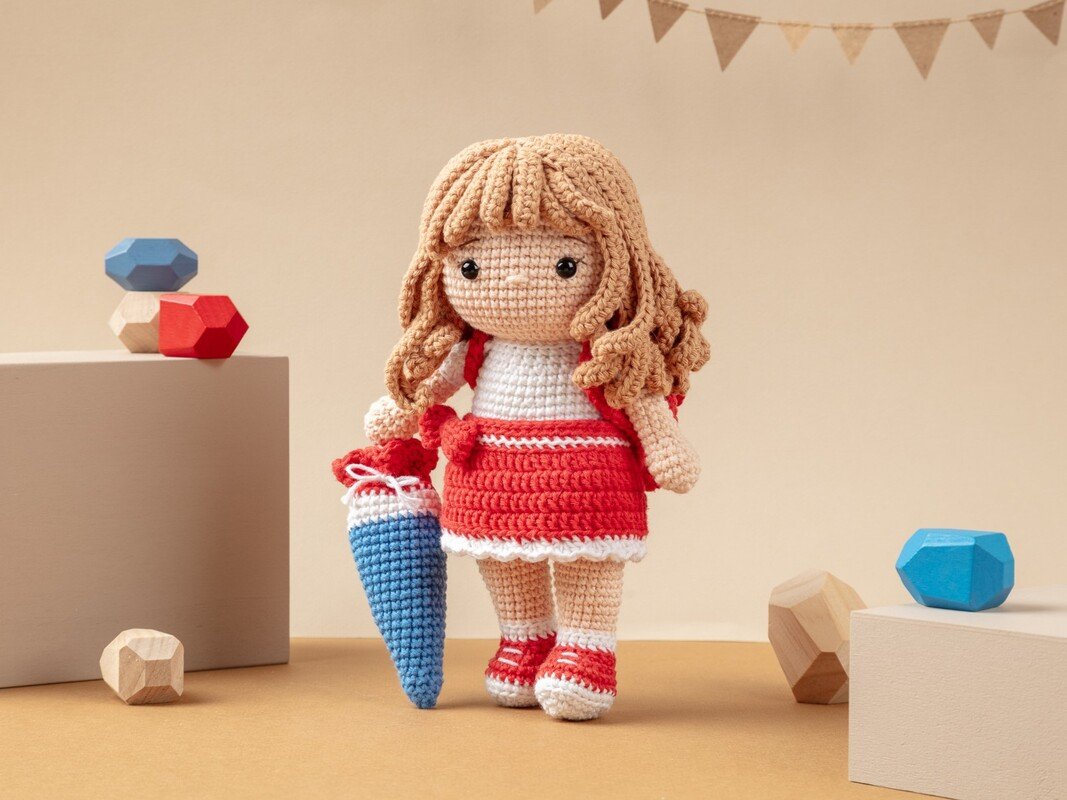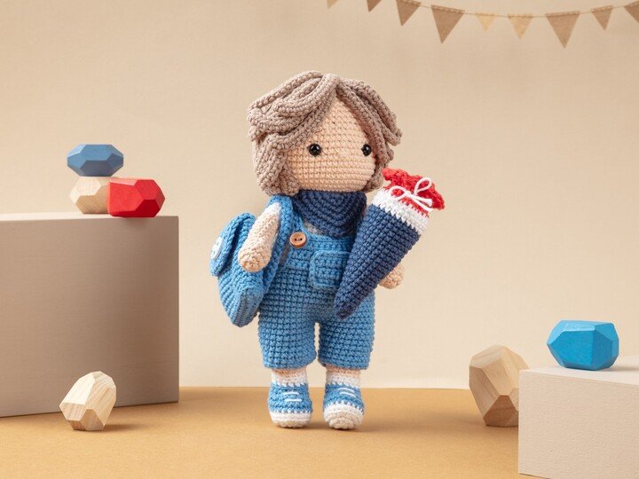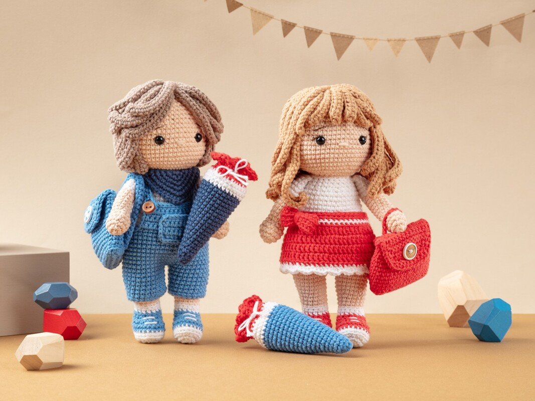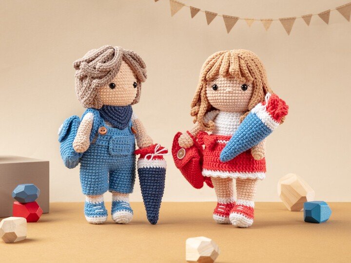Die ist eine digitale, deutschsprachige Häkelanleitung für die Schulanfänger Paula und Paul. Die Anleitung beinhaltet die Beschreibung für die Puppen, die Kleidung (Hose oder Rock), die Schultasche und die Schultüte.