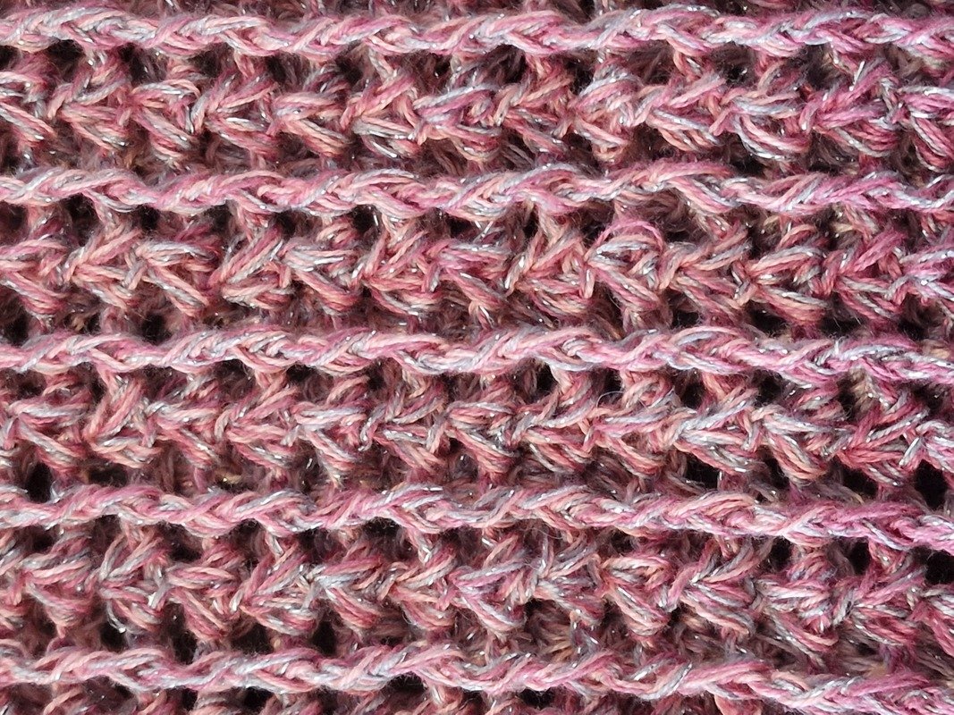 Es wird in zwei Teilen quer gehäkelt und zum Schluss werden die beiden Teile zusammen gehäkelt. Ich habe mit 2 identischen 3fädigen Bobbel (gefachtes Farbverlaufsgarn) gearbeitet und damit es schön locker wird mit einer 4er Häkelnadel.