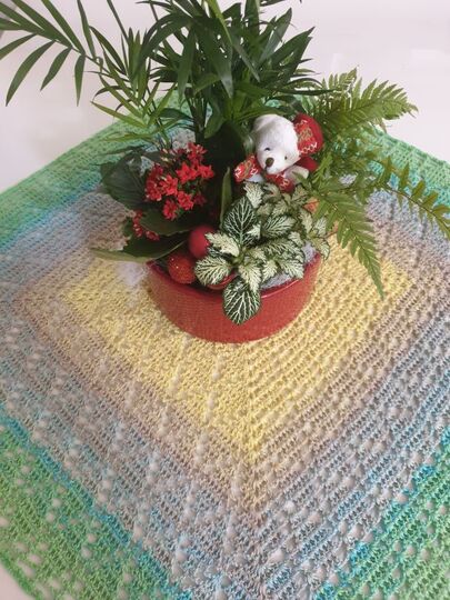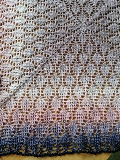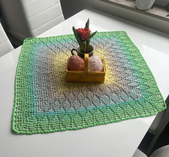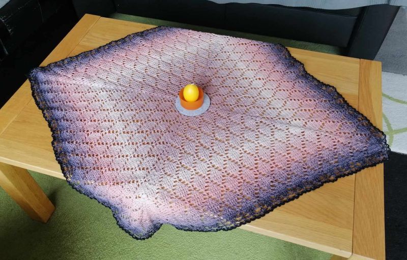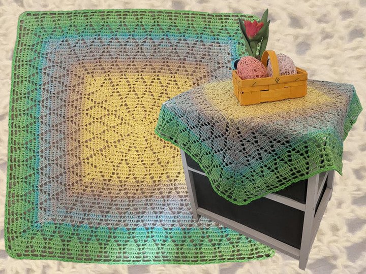 Die Decke wird von der Mitte in Runden gehäkelt. Gehäkelt werden kann mit einem Filethäkelgarn, mercerisierte Baumwolle oder mit Farbverlaufsgarnen.