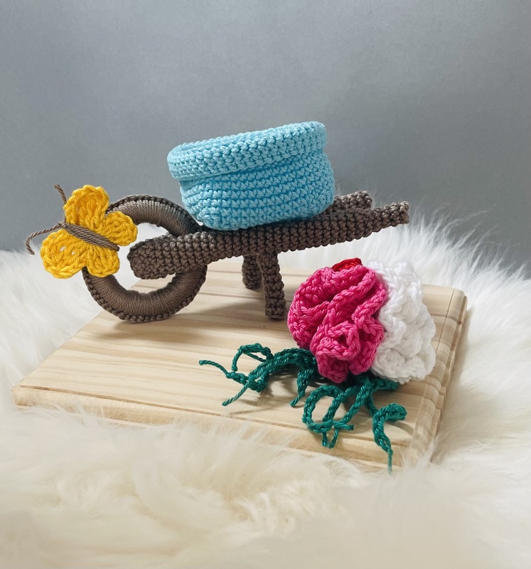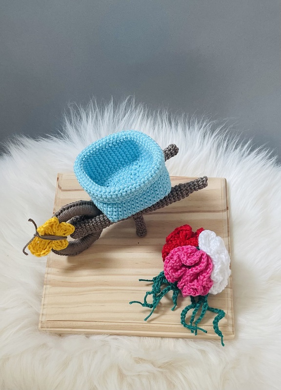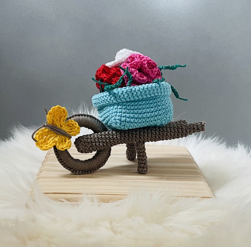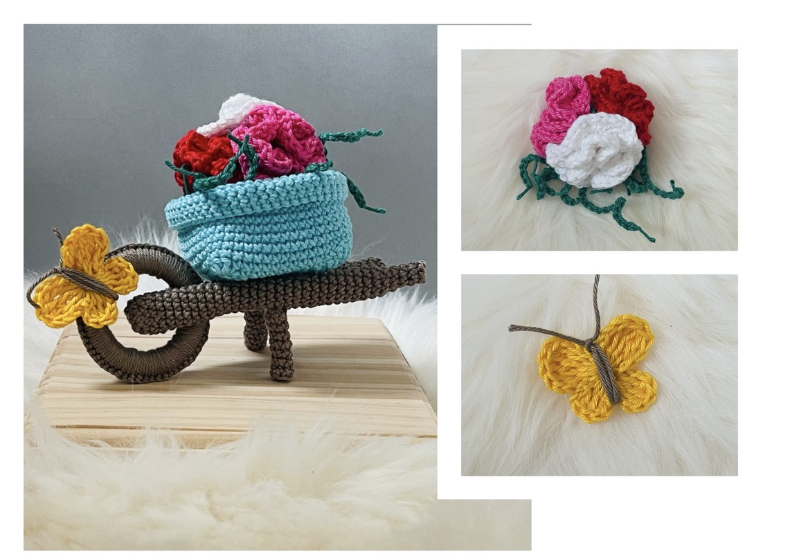 Mit dieser Häkelanleitung kann man in einfachen Schritten, die Schubkarre, das Körbchen, den Schmetterling und die Nelken nacharbeiten. Die Häkelanleitung ist Schritt für Schritt im Detail erklärt und mit zahlreichen Fotos versehen. Die Dekoration lässt sich auch perfekt als Geschenk umwandeln, denn das Körbchen kann man mit tollen kleinen Ideen füllen.