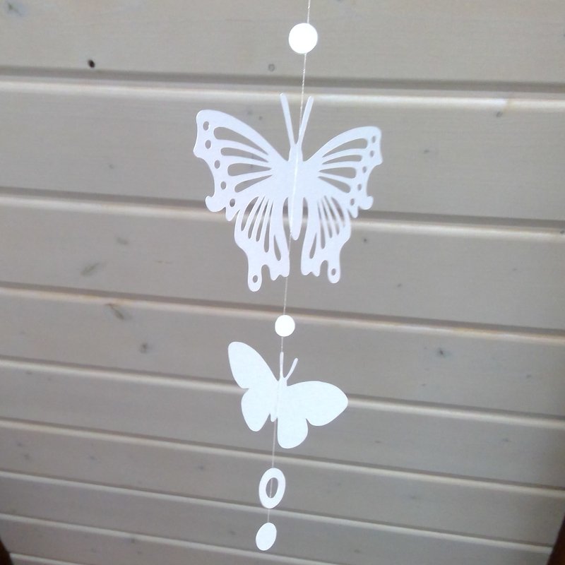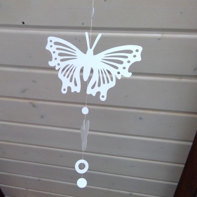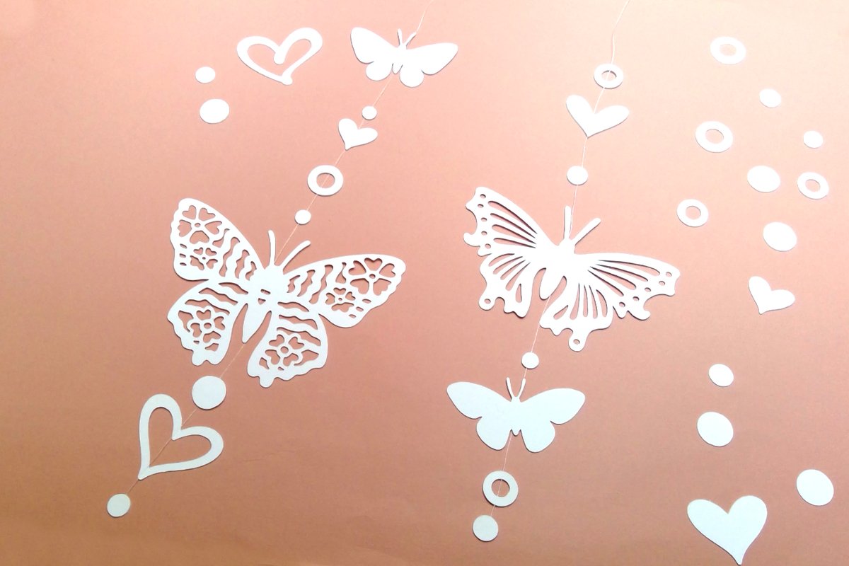 Als Hängedekoration an Faden angeklebt wirken die Schmetterlinge und Herzen