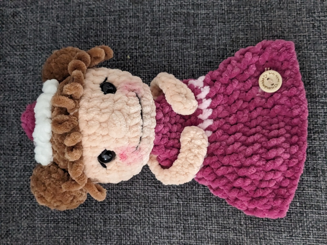 Mit deiner Häkelnadel in Stärke 4,0 und der in der Anleitung angegebenen Wolle - Chenille 100 g /120 m - wird das Püppchen ca. 22 cm groß.