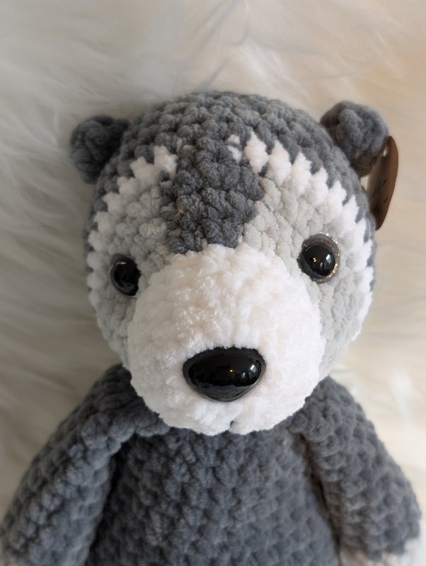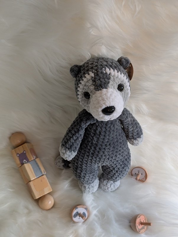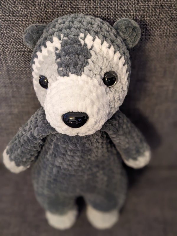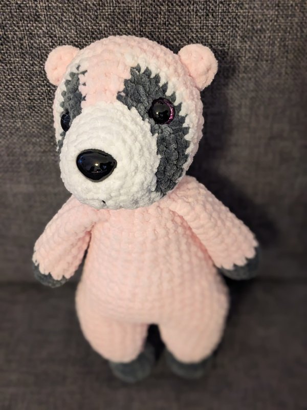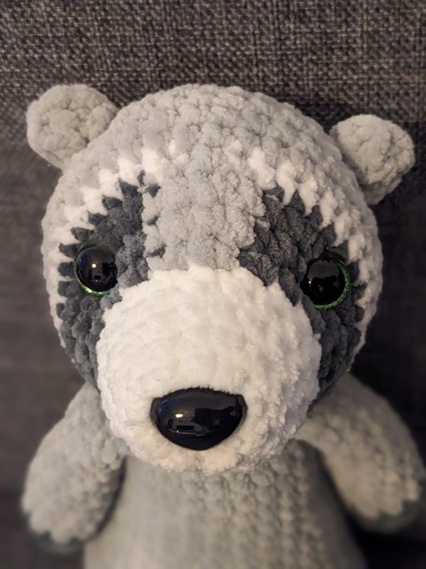 Besonders schön ist, dass man bei diesem Tier ausschließlich den Kopf annähen muss. Arme und Beine und Schwanz werden im Verlauf der Arbeit mit eingehäkelt und die Ohren werden herausgearbeitet.