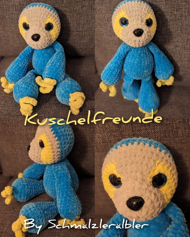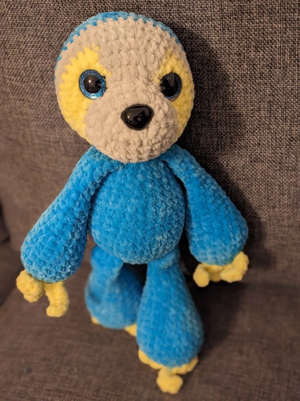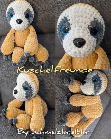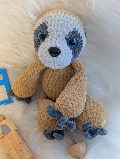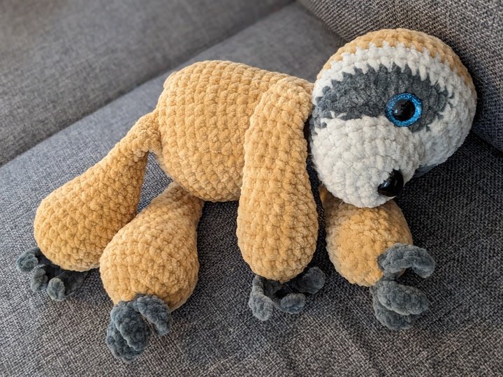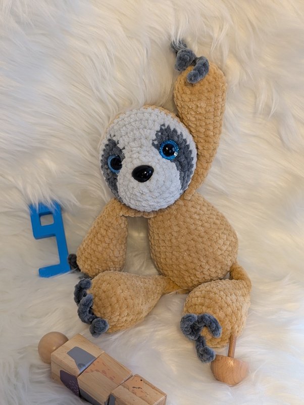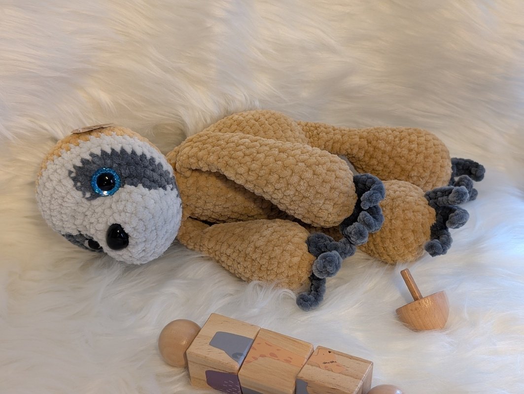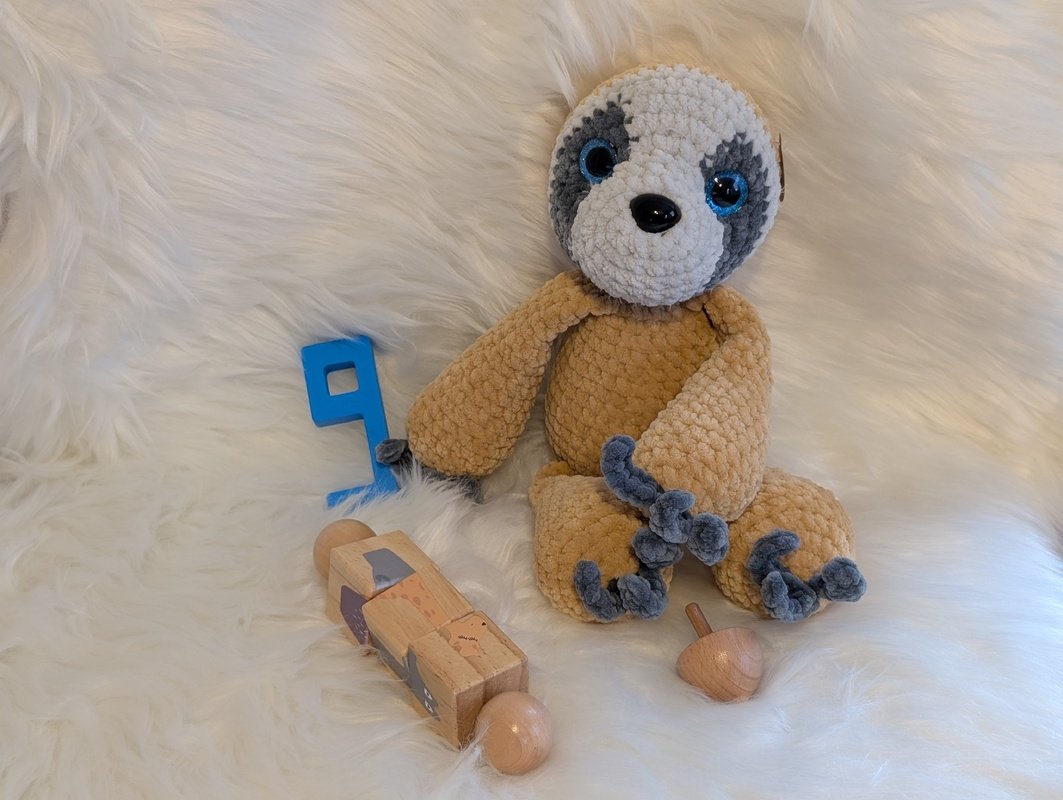 Besonders schön ist, dass man bei diesem Faultier ausschließlich den Kopf annähen muss. Arme und Beine werden im Verlauf der Arbeit mit eingehäkelt.