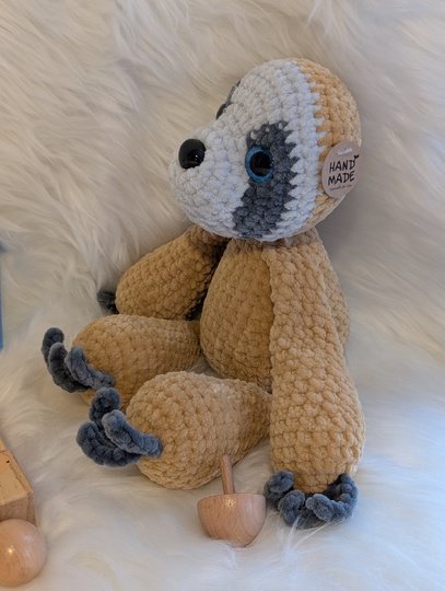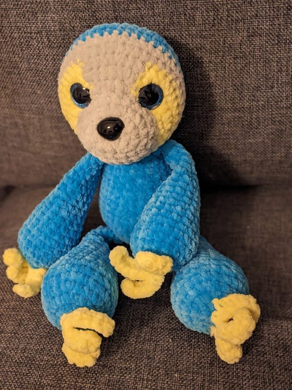 Mit einer Häkelnadel in Stärke 4,0 und der in der Anleitung angegebenen Wolle - Chenille 100 g /120 m - wird das Faultier ca. 30 cm groß.