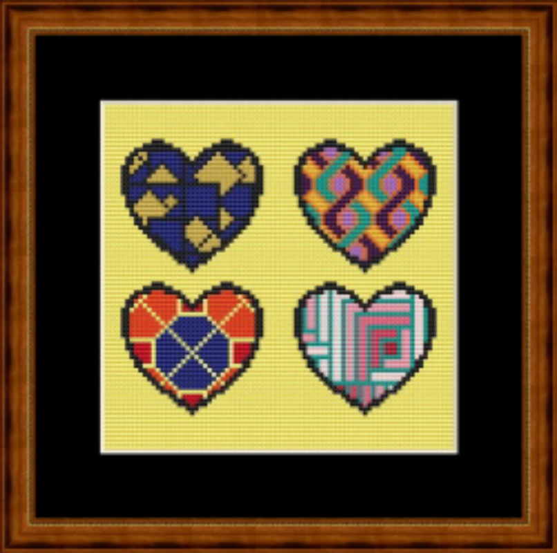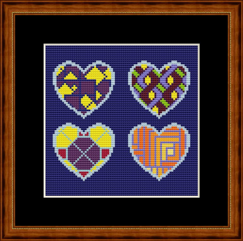 Vier Herzen mit verschiedenen geometrischen Füllungen. Du kannst jedes einzeln sticken oder alle auf einem Bild. Die Farben kannst du nach deinem Geschmack kombinieren. Einige Beispiele siehst du auf den Bildern. Die passenden Farbnummern erhältst du zusammen mit der Stickvorlage. Viel Spaß beim Nachsticken.