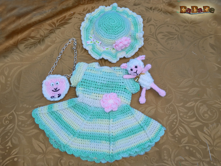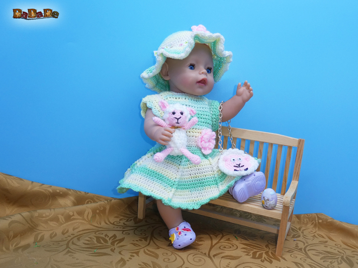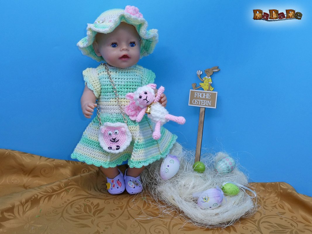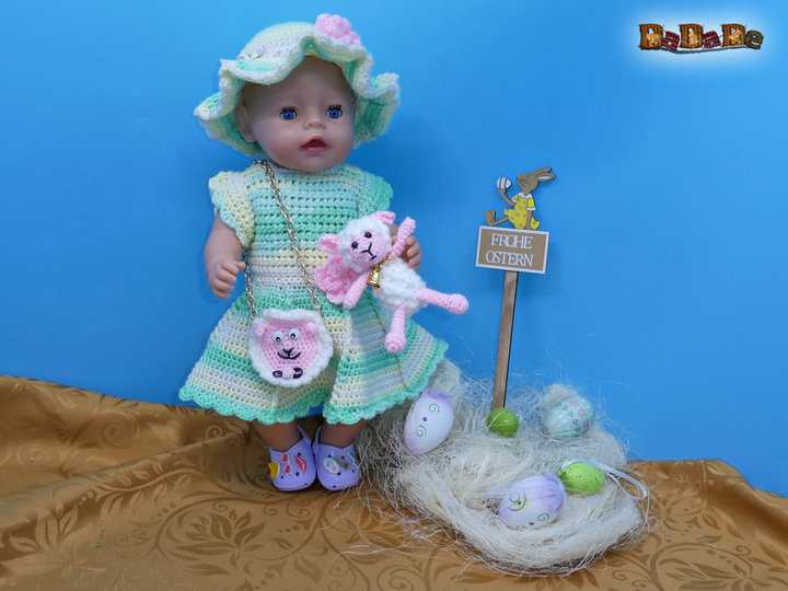 mit Kleidchen, Sonnen-Hut, Tasche und süßem Schäfchen. Auch Püppis brauchen was zum Kuscheln.