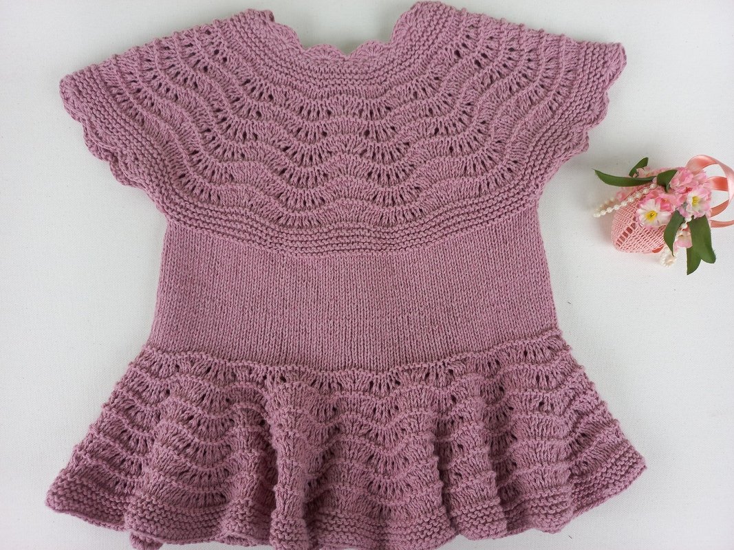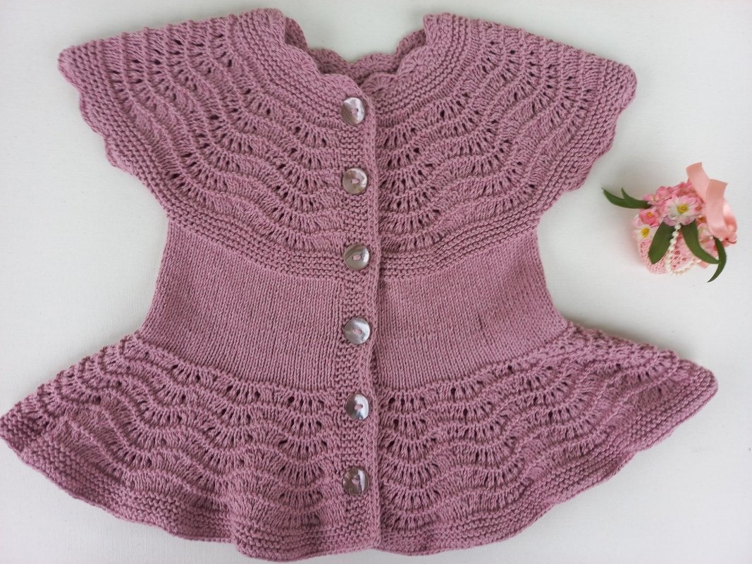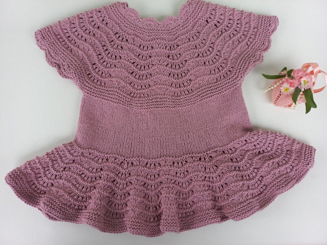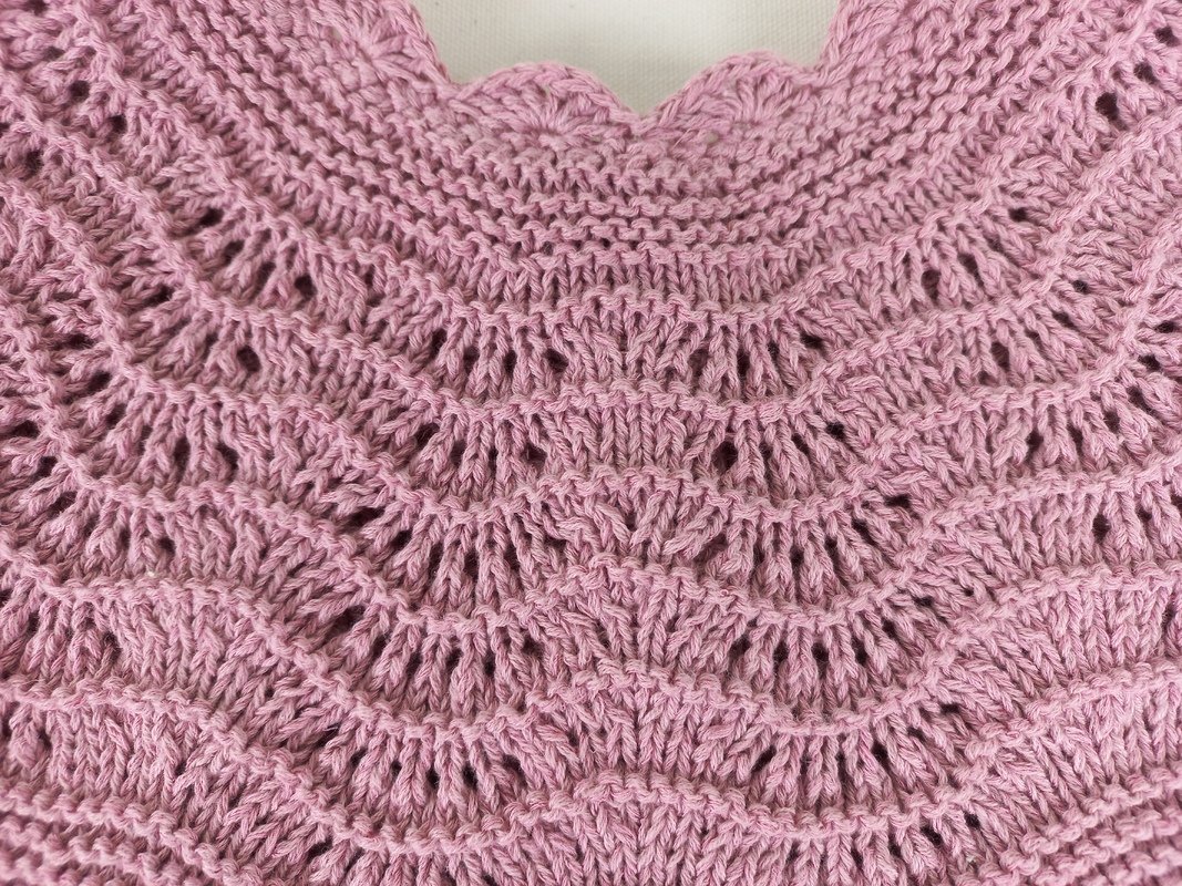 Hier bekommst du eine bis ins kleinste Detail erklärte 15-seitige Strickanleitung in deutsch für eine wunderschöne Babyweste/Mädchenweste/Tunika mit Rundpasse und Volant in einem tollen Lochmuster. Die Weste ist aus einer sehr weichen Baumwolle/Viskose/Leinen-Mischung in Größe 92/98 gestrickt und passend für ca. 2-3 Jahre. Die etwas längere Tunika ist ärmellos und wird von oben nach unten gestrickt. Das Muster ist sehr einfach und ich habe sowohl die Rundpasse als auch den Volant in einer Tabelle Reihe für Reihe aufgelistet. Man muss also einfach nach der Tabelle stricken, ohne Rechnen, Messen oder Umsetzen einer Strickschrift. Durch die Zunahmen im Muster entsteht die Rundpasse und auch der Volant. Man hat keine einzige Naht, was nicht nur toll aussieht, sondern auch super praktisch ist, weil man nichts mehr zusammennähen muss. Die Anleitung enthält auch die genauen Maße der Weste.
