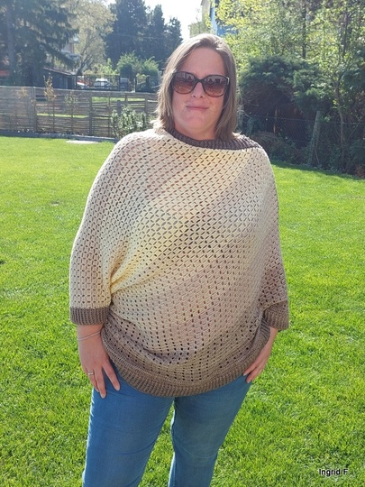 Dies entspricht einem Oversizepulli in Größe 40/42 bei einer Körpergröße von 180 cm. Verarbeitet habe ich den Pulli mit einer NS 3,75 mm.
