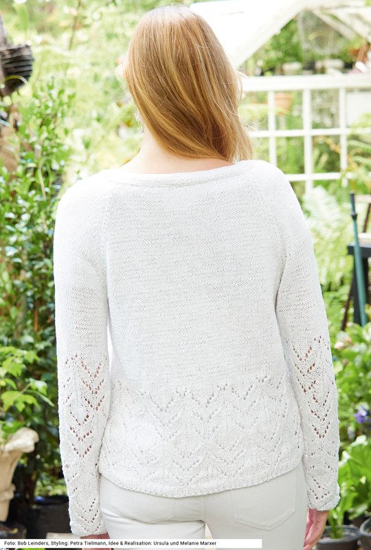 Die Raglanjacke aus Baumwolle mit recycelten Polyester hat einen sanften Schimmereffekt. Sie ist im unteren Drittel sowie an den Ärmel mit einem filigranen Ajourmuster gearbeitet, der Rest ist glatt rechts gestrickt. Der V-Ausschnitt streckt optisch und kaschiert auch eine etwas üppigere Oberweite – macht somit eine hervorragende Figur. Die Knopflochblende wird gleich mitgestrickt und um den rückwärtigen Halsausschnitt weitergeführt. Die schmalen Bündchen am Saum und an den Ärmeln sind im 1/1-Rippenmuster gearbeitet. Eine Anleitung hierfür gibt es für die Größen 36/38, 42/44 und 48/50.