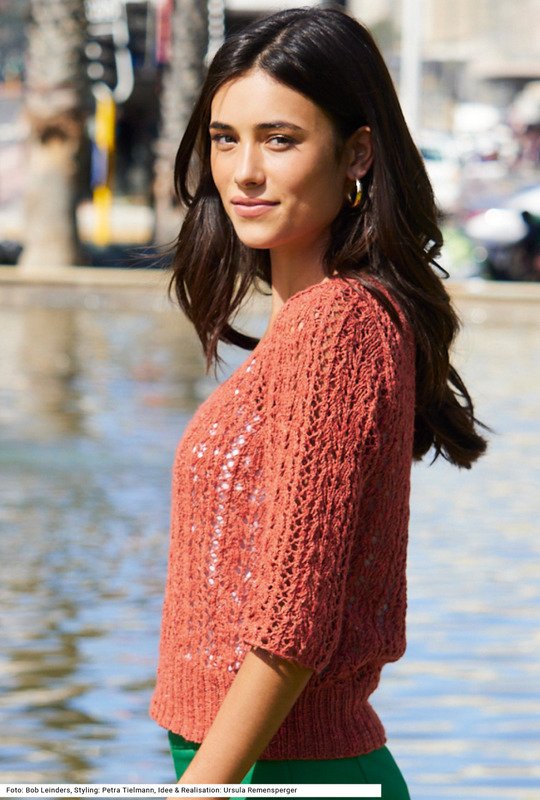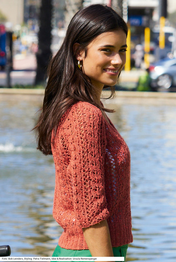 Dieser modisch kurz geschnittene Ajourmusterpulli mit Ärmeln, die bis zum Ellenbogen reichen, rückt die Hals- und Brustpartie in den Fokus: Der tiefe V-Ausschnitt mit extraschmaler Blende sieht besonders feminin aus. Der hohe Bund wird im 2/2-Rippenmuster gearbeitet. Ein angenehm auf der Haut liegendes Garn aus Leinen, Viskose, Baumwolle und etwas Polyacryl in warmem Rost läuft gut über die Nadel. Wer mehr Haut zeigen will, trägt den Pulli nur mit einem Bustier darunter, schön sieht aber auch ein weißes T-Shirt darunter aus. Die Anleitung dazu steht für die Größen 36/38, 42/44 und 48/50 zum Download bereit.