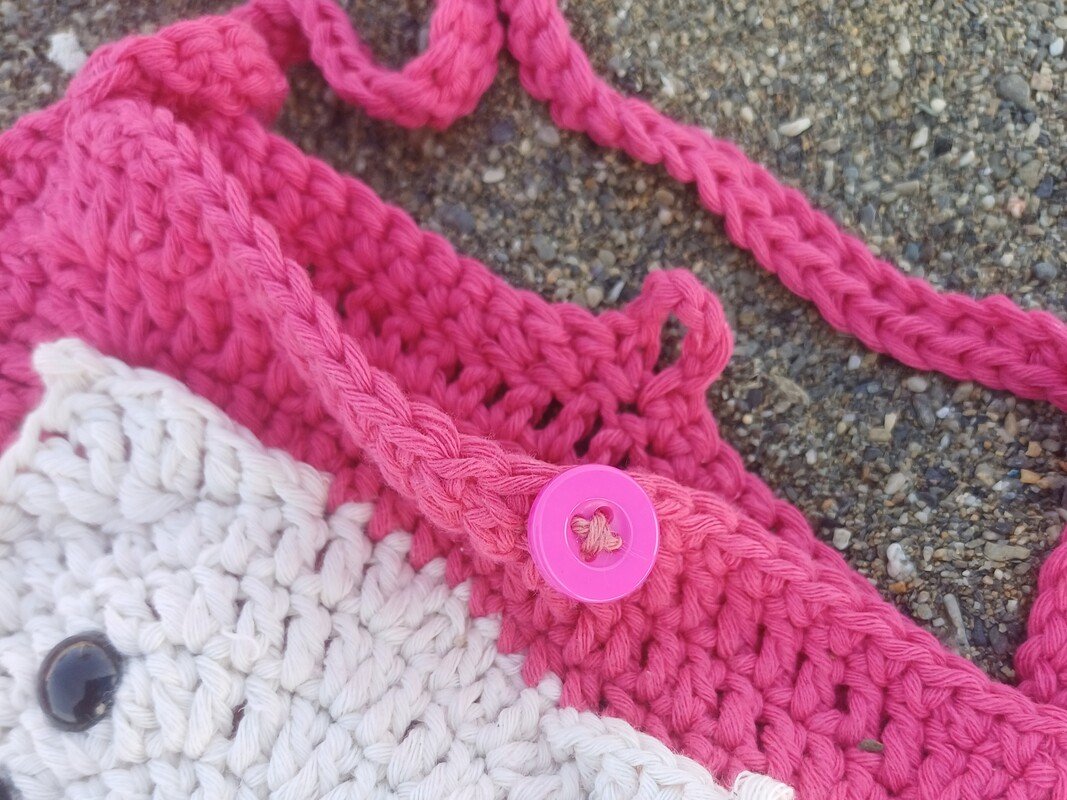 Für die kleine Tasche häkeln wir zunächst zwei Granny Squares. Das obere Granny wird zweifarbig gehäkelt. Ohren und Gesicht werden nachträglich gearbeitet. Anschließend werde beide Grannys zusammengehäkelt. Am oberen Rand häkeln wir eine Umrandung mit einer Schlaufe für den Knopf. Zum Schluss häkeln wir den Schulterriemen.