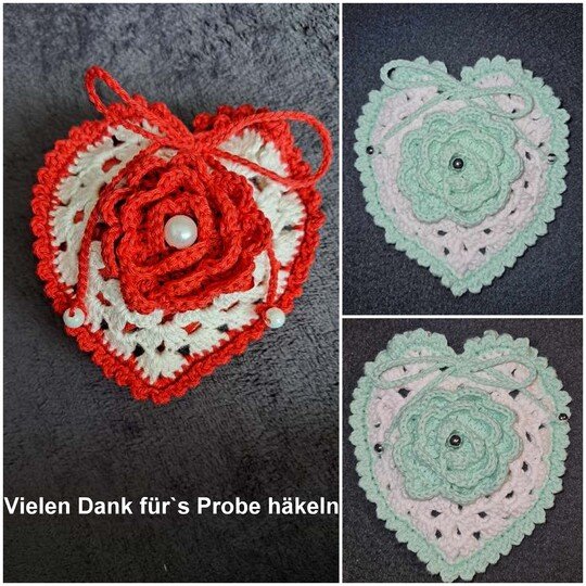 Die Herzen werden vorwiegend mit Stäbchen gehäkelt. Teilweise wird ins vordere bzw hintere Maschenglied gearbeitet.