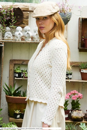 Dieses weiße kurz geschnittene Jäckchen mit einem dezenten Allover-Lochmuster punktet mit seinen hübschen Muschelkanten, die dem Modell einen femininen Charakter geben. Das löchrige Muster ist sehr einfach und auch die gehäkelten Muscheln gelingen ganz leicht. Der Schnitt ist tailliert, die Ärmel haben eine Armkugel – was an den Schultern einen besonders guten Sitz garantiert. Geschlossen wird die Jacke mit nur drei Knöpfen, das reicht völlig, ist doch der V-Ausschnitt recht tief geschnitten. Eine Anleitung für die Jacke aus reiner Baumwolle gibt es für die Größen 36/38, 40/42 und 44/46.
