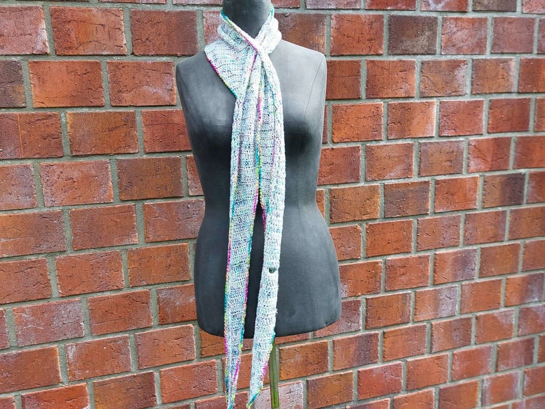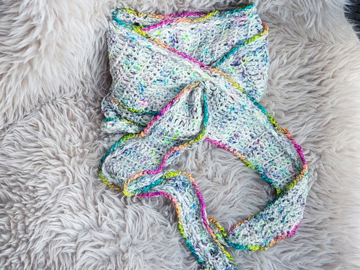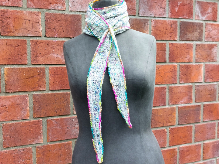 Dieser Mini-Schal ist ein optisches Highlight für jede Garderobe. Er ist schnell aus jeder Wolle gehäkelt und eignet sich auch prima als Reste-Projekt. Aufgepimpt mit Glitzer wird er zum echten Hingucker und lässt sich durch zwei clever positionierte Einstecklöcher vielseitig binden.